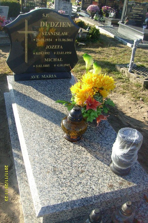 Grób: IX,I,2i3 Dudzień Michał ur.:1885-02-05 zm.:1945-10-04 Dudzień Józefa ur.:1892-09-08 zm.:1954-01-23 Dudzień Stanisław ur.:1924-09-29 zm.:2011-06-11 |