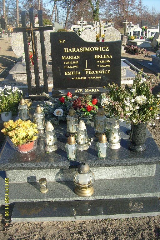 Grób: V,II,15i16 Harasimowicz Helena ur.:1926-08-08 zm.:2006-02-07 Harasimowicz Marian ur.:1925-12-25 zm.:1977-02-13 Piecewicz Emilia ur.:1902-04-10 zm.:1981-08-10 |