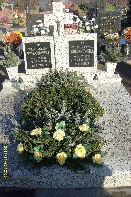 Grób: V,IV,3i4 Romanowska Wincentyna ur.:1895-07-11 zm.:1982-10-28 Romanowski Józef ur.:1935-02-11 zm.:2016-05-15 Romanowski Władysław ur.:1897-12-11 zm.:1980-11-30 |