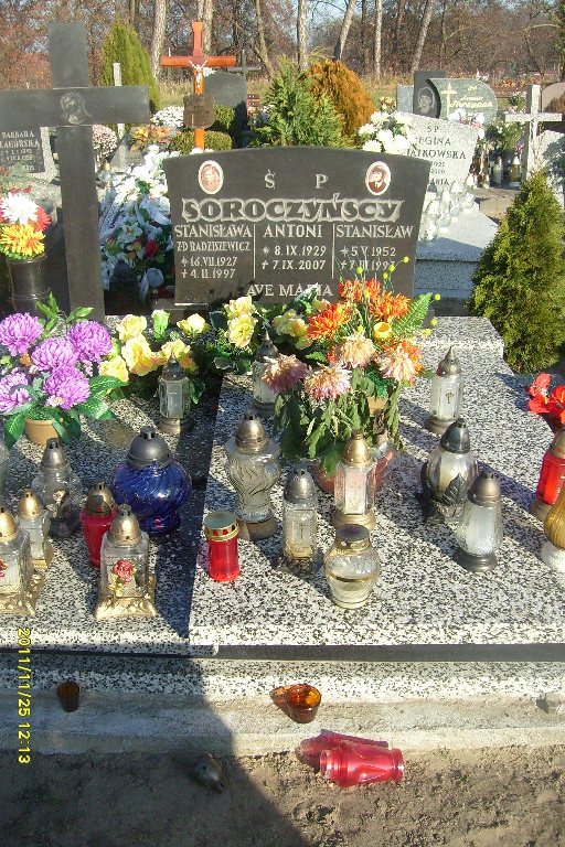 Grób: V,V,21i22 Soroczyńska Stanisława ur.:1927-07-16 zm.:1997-02-04 Soroczyński Stanisław ur.:1952-05-05 zm.:1997-03-07 Soroczyński Antoni ur.:1929-09-08 zm.:2007-09-07 |