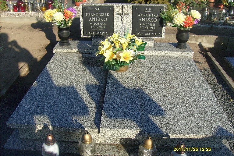 Grób: V,VI,10i11 Aniśko Franciszek ur.:1925-03-19 zm.:1993-10-04 Aniśko Weronika ur.:1926-07-16 zm.:1985-09-16 |