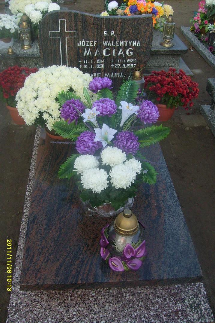 Grób: I,III,12 Maciąg Walentyna ur.:1924-01-11 zm.:1997-09-27 Maciąg Józef ur.:1914-01-11 zm.:1950-01-02 |
