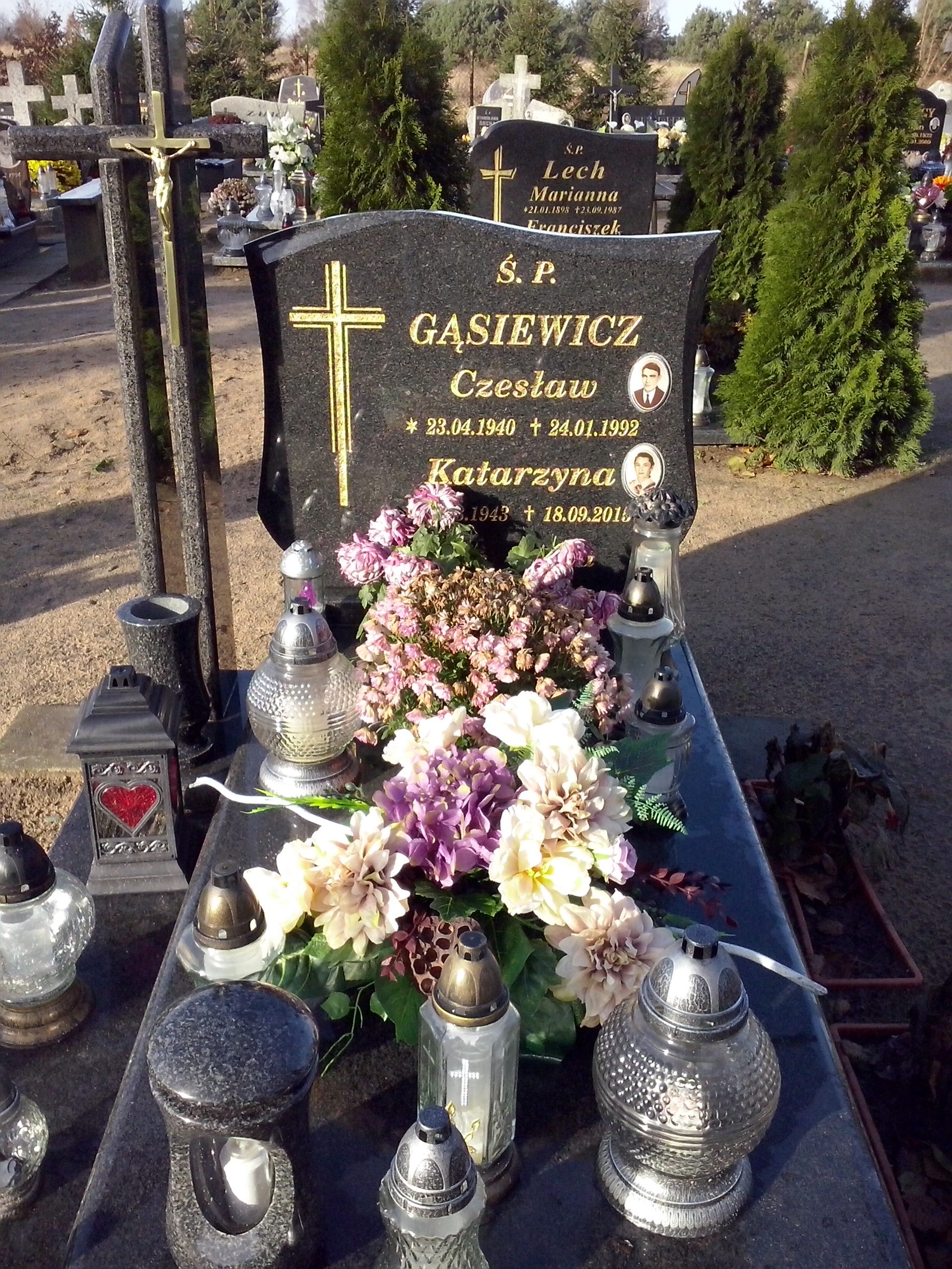 Grób: I,II,18 Gąsiewicz Czesław ur.:1940-04-23 zm.:1992-01-24 Gąsiewicz Katarzyna ur.:1943-03-01 zm.:2015-09-18 |