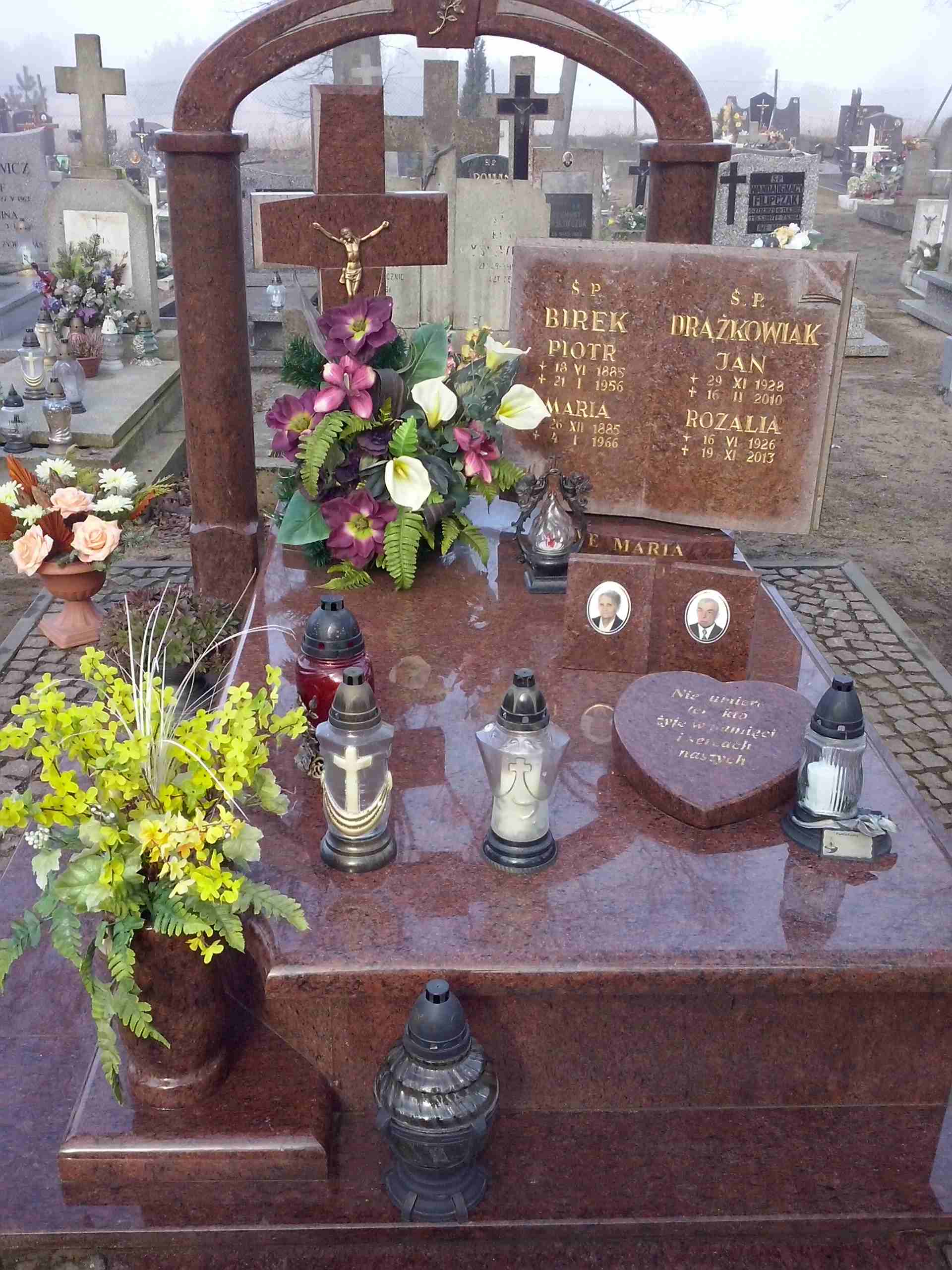 Grób: I,II,49i50 Birek Piotr ur.:1885-06-18 zm.:1956-01-21 Drążkowiak Jan ur.:1928-11-09 zm.:2010-02-16 Birek Maria ur.:1885-12-26 zm.:1966-01-04 Drążkowiak Rozalia ur.:1926-06-16 zm.:2013-11-19 |
