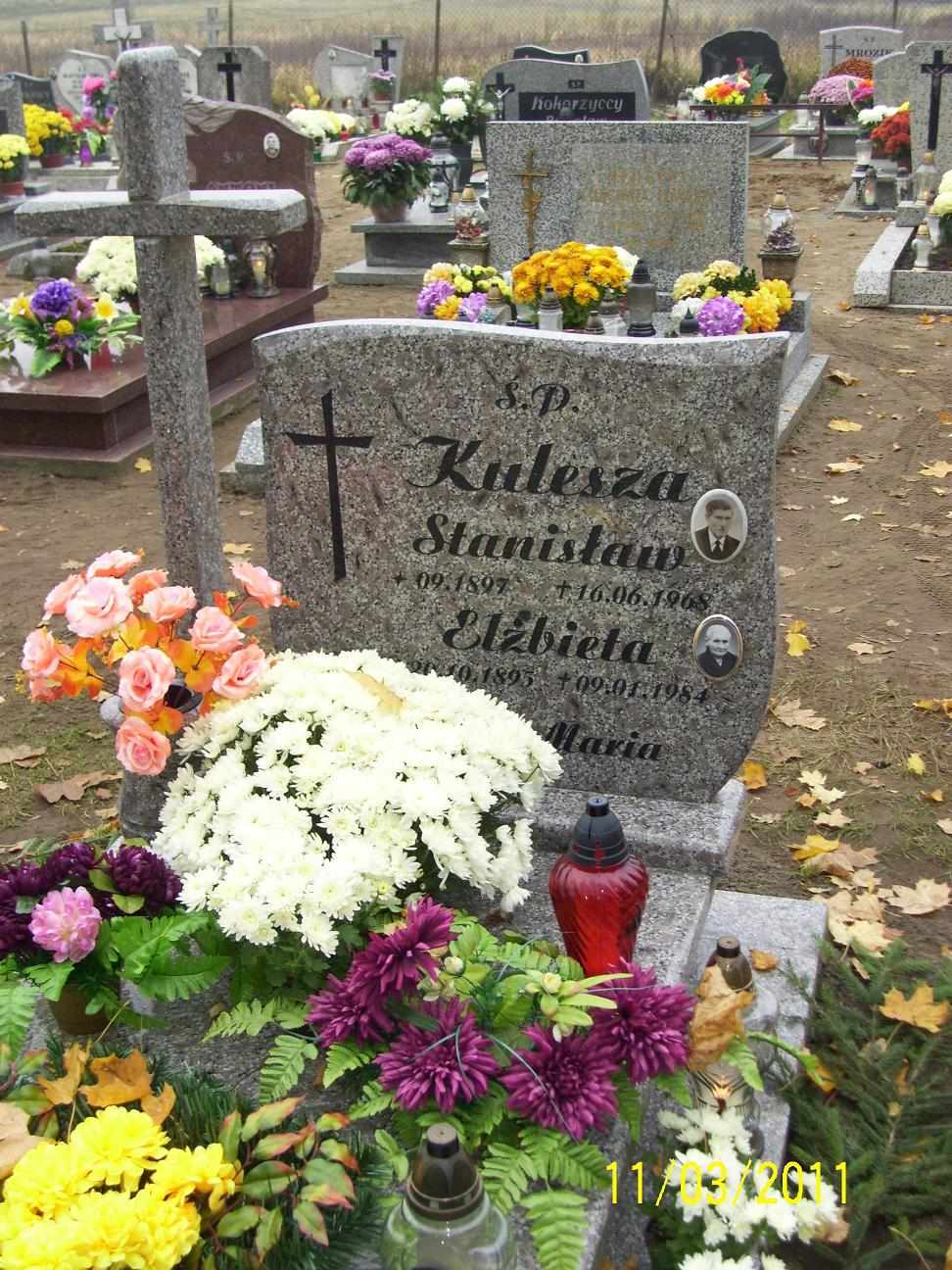 Grób: I,III,30i31 Kulesza Stanisław ur.:1897-09-01 zm.:1968-06-16 Kulesza Elżbieta ur.:1895-10-20 zm.:1984-01-09 |