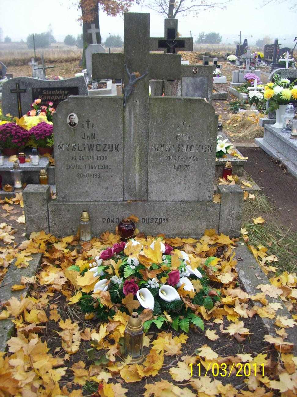 Grób: I,III,54i55 Myśliwczuk Jan ur.:1930-08-26 zm.:1961-11-20 Myśliwczuk Ewa ur.:1924-01-01 zm.:1959-10-29 |