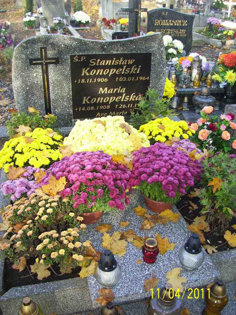 Grób: I,IV,53i54 Konopelski Stanisław ur.:1906-11-18 zm.:1964-01-03 Konopelska Maria ur.:1908-08-14 zm.:1985-11-26 |