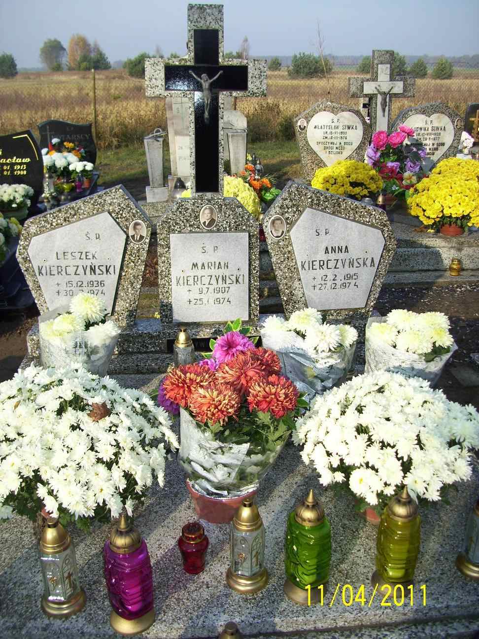 Grób: I,V,21i22i23 Kierczyński Leszek ur.:1936-12-15 zm.:1974-03-30 Kierczyński Marian ur.:1907-07-09 zm.:1974-01-25 Kierczyńska Anna ur.:1915-02-12 zm.:1974-12-27 |
