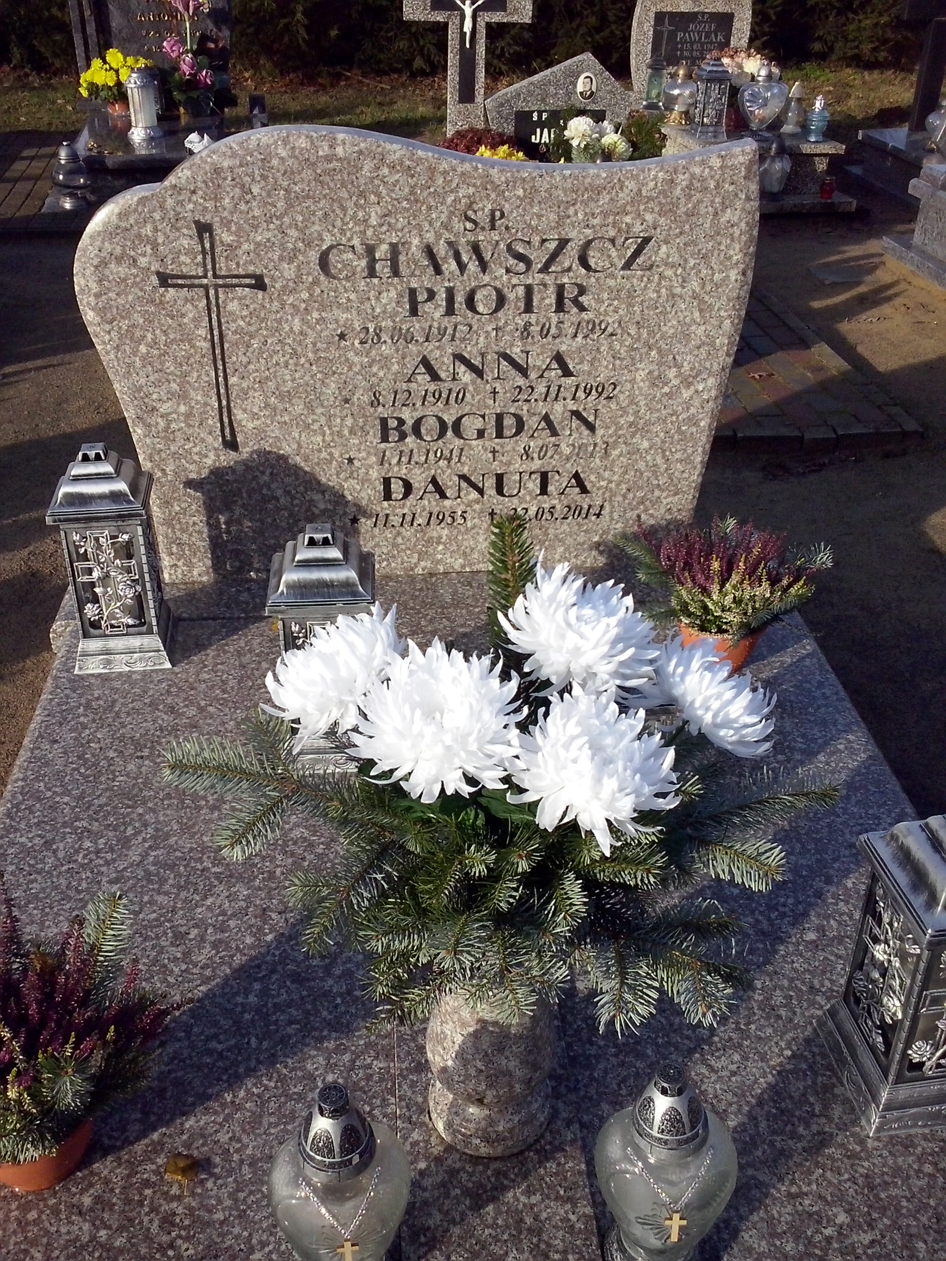 Grób: I,V,5i6 Chawszcz Anna ur.:1910-12-08 zm.:1992-11-22 Chawszcz Piotr ur.:1912-06-28 zm.:1992-05-08 Chawszcz Bogdan ur.:1941-11-01 zm.:2013-07-08 Chawszcz Danuta ur.:1955-11-11 zm.:2014-05-22 |
