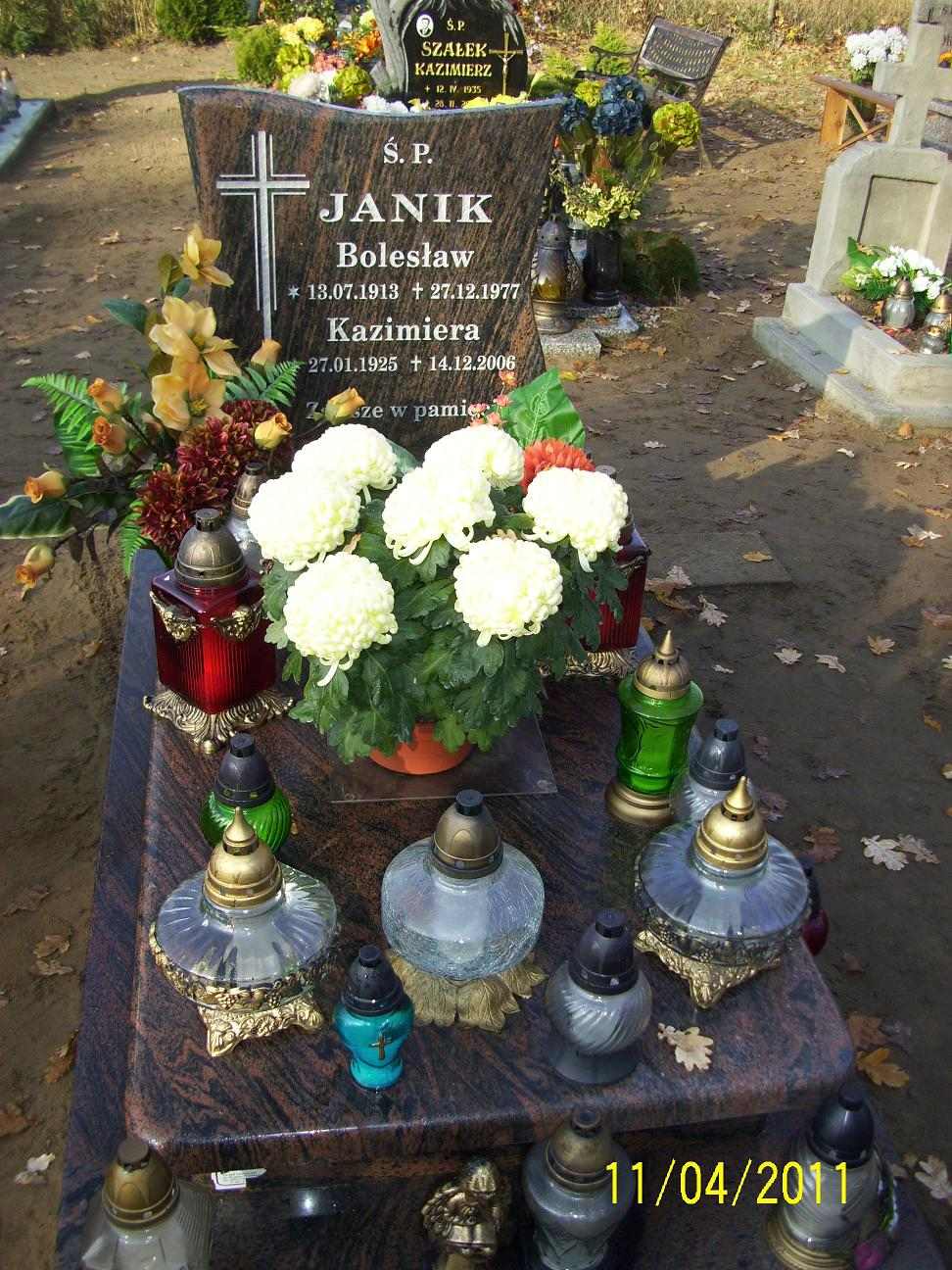 Grób: I,VI,40 Janik Bolesław ur.:1913-07-13 zm.:1977-12-27 Janik Kazimiera ur.:1925-01-27 zm.:2006-12-14 |