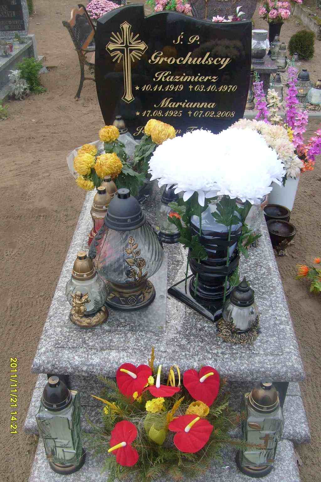 Grób: II,I,6 Grochulski Kazimierz ur.:1919-11-10 zm.:1970-10-03 Grochulska Marianna ur.:1925-08-17 zm.:2008-02-07 |