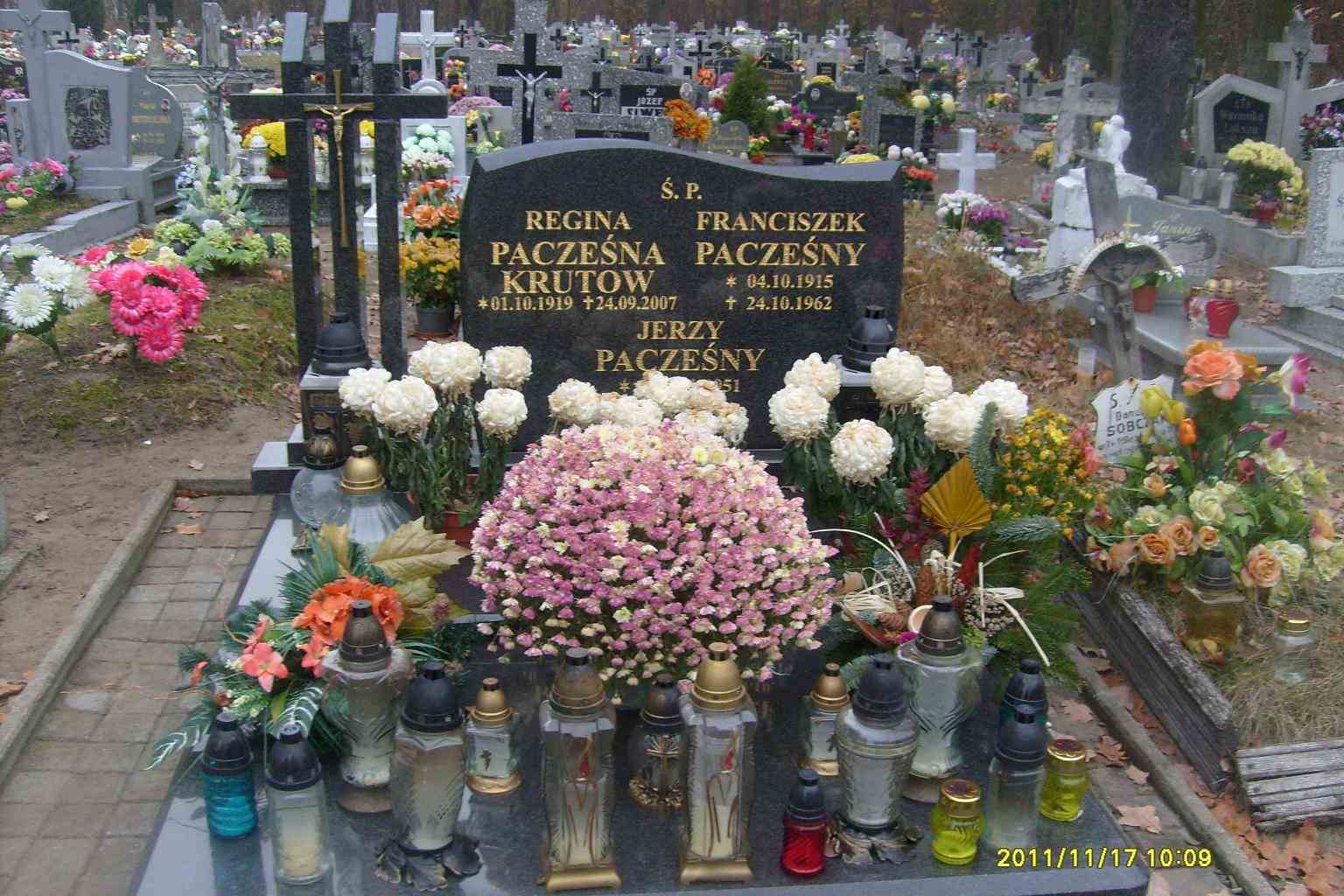 Grób: I,III,10 Pacześna Krutow Regina ur.:1919-10-01 zm.:2007-09-24 Pacześny Jerzy ur.:1950-01-01 zm.:1951-01-01 Pacześny Franciszek ur.:1915-10-04 zm.:1962-10-24 |