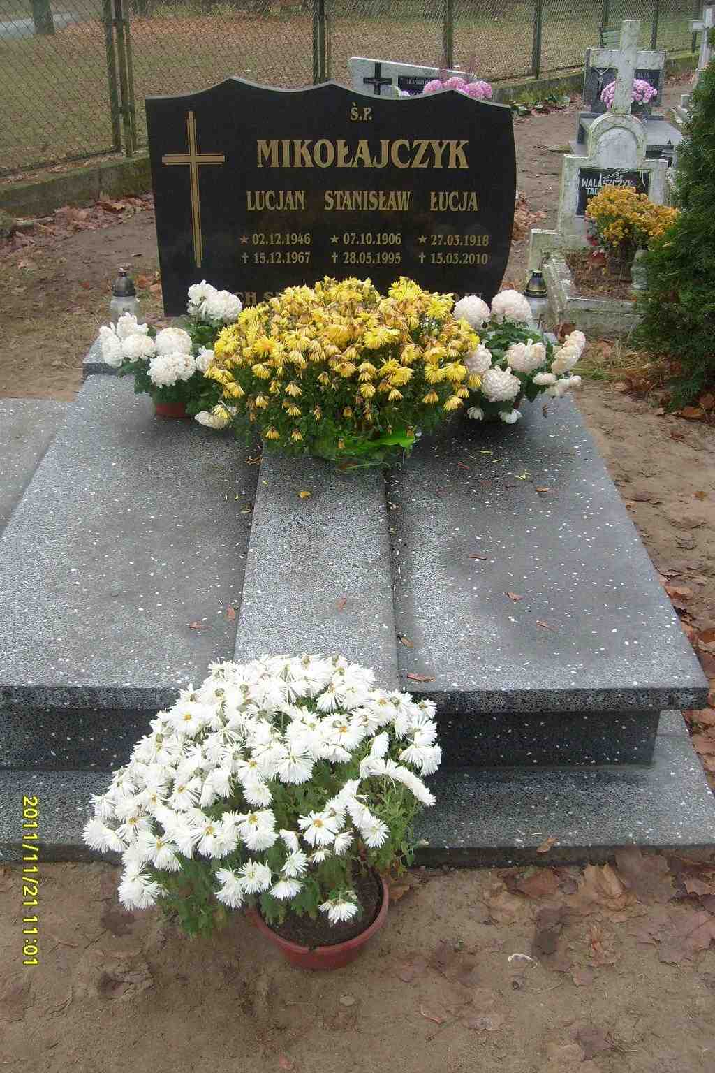 Grób: II,I,1i2 Mikołajczyk Lucjan ur.:1946-12-02 zm.:1967-12-15 Mikołajczyk Stanisław ur.:1906-10-07 zm.:1995-05-28 Mikołajczyk Łucja ur.:1918-03-27 zm.:2010-03-15 Mikołajczyk Leonard ur.:1945-12-24 zm.:2020-06-07 Mikołajczyk Genowefa Kazimiera ur.:1943-09-17 zm.:2020-08-04 Mikołajczyk Wiesław ur.:1967-08-16 zm.:2021-04-22 |