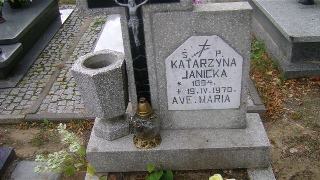 Grób: X.10.6 Janicka Katarzyna ur.:28-02-1898 zm.:19-04-1970 Janicki Stefan ur.:22-11-1930 zm.:13-09-1976 Janicki Franciszek ur.:09-03-1879 zm.:28-01-1946 Woźniak Stanisław ur.:22-07-1955 zm.:15-12-1976 Woźniak Rozalia ur.:27-12-1930 zm.:28-06-2018 |