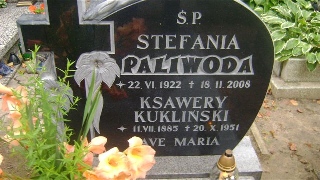 Grób: XIX.16.10 Kukliński Ksawery ur.:11-07-1885 zm.:20-10-1951 Paliwoda Stefania ur.:22-06-1922 zm.:18-02-2008 |