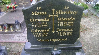 Grób: XVII.12.4 Moroz Urszula ur.:01-11-1914 zm.:14-11-1984 Moroz Edward ur.:18-12-1906 zm.:06-08-1982 Śliwińska Wanda ur.:21-06-1949 zm.:28-04-2010 Śliwiński Janusz ur.:14-02-1949 zm.:30-07-2010 |