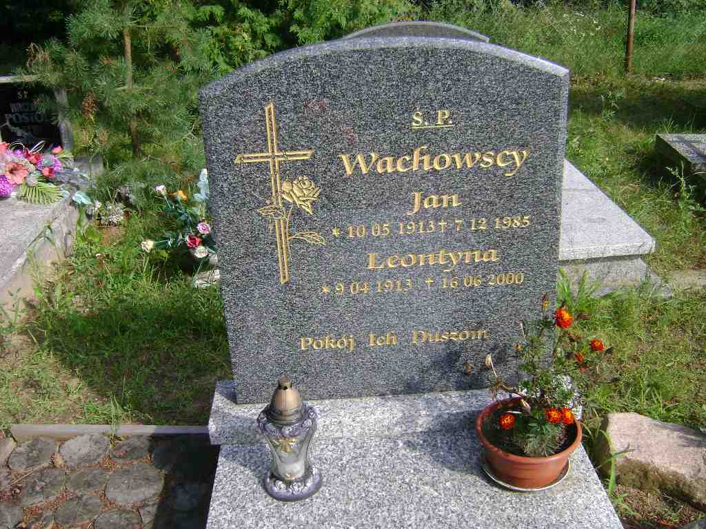 Grób: I.2.3 Wachowski Jan ur.:10.05.1913 zm.:07.12.1985 Wachowska Leontyna ur.:9.04.1913 zm.:16.06.2000 Lipczyńska- Biała Renata ur.:02-10-1941 zm.:23-06-2020 |