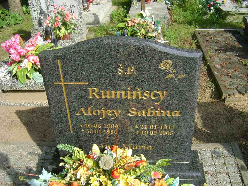 Grób: I.3.2 Rumiński Alojzy ur.:10.05.1900 zm.:03.01.1986 Rumińska Sabina ur.:1913.01.29 zm.:2006.09.10 |
