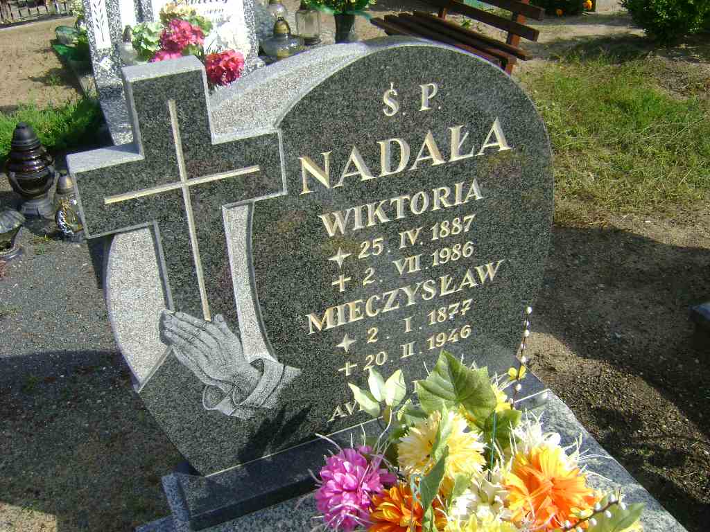 Grób: I.5.10 Nadała Mieczysław ur.:02.01.1877 zm.:20.02.1946 Nadała Wiktoria ur.:25.04.1887 zm.:02.07.1986 |