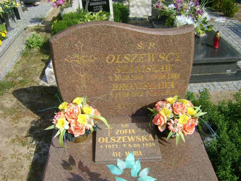 Grób: I.5.15 Olszewska Bronisława ur.:11.03.1912 zm.:14.04.2002 Olszewski Stanisław ur.:18.08.1927 zm.:13.07.2002 Olszewska Zofia ur.:__.__.1877 zm.:__.__.1958 |