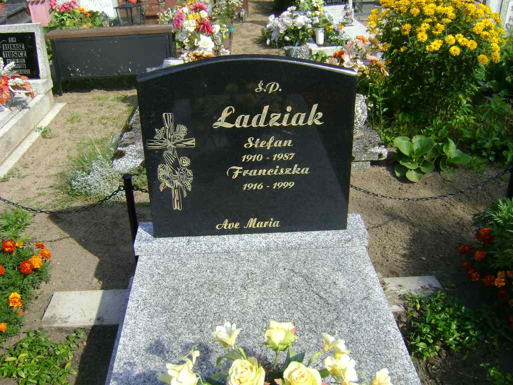 Grób: I.8.14 Ładziak Franciszka ur.:__.__.1916 zm.:__.__.1999 Ładziak Stefan ur.:__.__.1910 zm.:__.__.1987 |