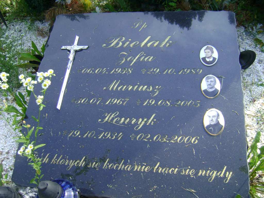 Grób: II.14.14 Bielak Henryk ur.:1934.10.19 zm.:2006.03.02 Bielak Mariusz ur.:30.07.1967 zm.:19.08.2005 Bielak Zofia ur.:06.04.1938 zm.:29.10.1989 |