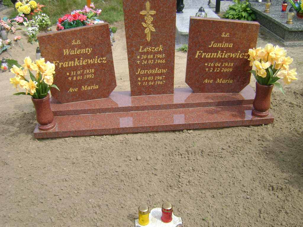 Grób: IX.10.21 Frankiewicz Walenty ur.:31.07.1938 zm.:08.01.1992 Frankiewicz Leszek ur.:20.08.1965 zm.:24.02.1966 Frankiewicz Jarosław ur.:10.03.1967 zm.:11.04.1967 |