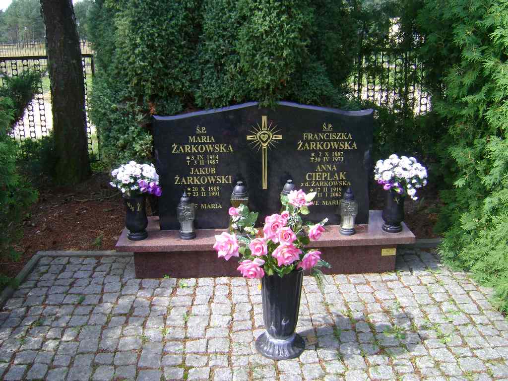 Grób: VII.7.1 Żarkowski Jakub Jan ur.:20.10.1909 zm.:23.02.1991 Cieplak Anna ur.:17.02.1919 zm.:11.01.2002 Żarkowska Maria ur.:03.09.1914 zm.:03.02.1987 Żarkowska Franciszka ur.:02.10.1887 zm.:30.04.1973 |