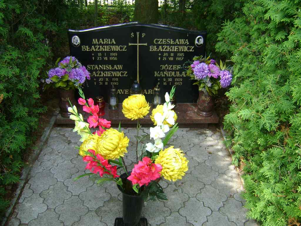 Grób: VIII.11.3 Błażkiewicz Stanisław ur.:20.11.1911 zm.:31.03.1990 Błażkiewicz Czesława ur.:28.03.1915 zm.:21.08.1987 Kańduła Józef ur.:09.12.1909 zm.:16.01.1953 Błażkiewicz Maria ur.:18.01.1919 zm.:23.07.1956 |