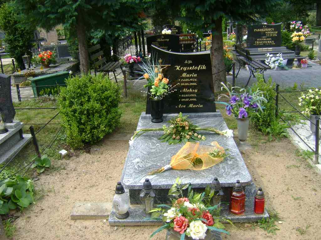 Grób: VIII.5.5 Krysztofik Maria ur.:1924.08.24 zm.:2006.08.08 Krysztofik Aleksy ur.:02.03.1918 zm.:09.07.1990 |