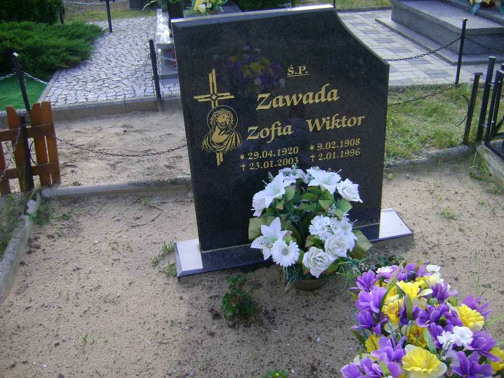 Grób: X.6.12 Zawada Wiktor ur.:09.02.1908 zm.:02.01.1996 Zawada Zofia ur.:29.04.1920 zm.:23.01.2003 |