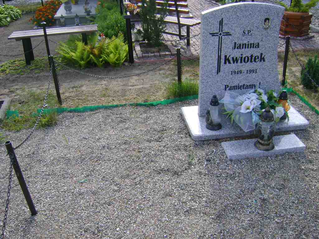 Grób: X.7.5 Kwiotek Janina ur.:13.06.1919 zm.:02.11.1993 Kwiotek Jerzy ur.:14-01-1947 zm.:13-03-2017 |