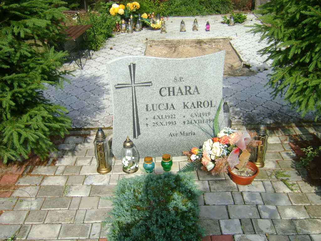 Grób: XI.3.6 Chara Łucja ur.:04.11.1922 zm.:24.10.1993 Chara Karol ur.:4.05.1919 zm.:24.08.1999 |