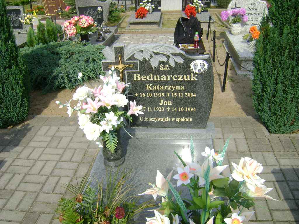 Grób: XI.5.4 Bednarczuk Katarzyna ur.:16.10.1911 zm.:15.11.2004 Bednarczuk Jan ur.:17.11.1923 zm.:14.10.1994 Bednarczuk Edward ur.:02-01-1951 zm.:16-12-2019 |