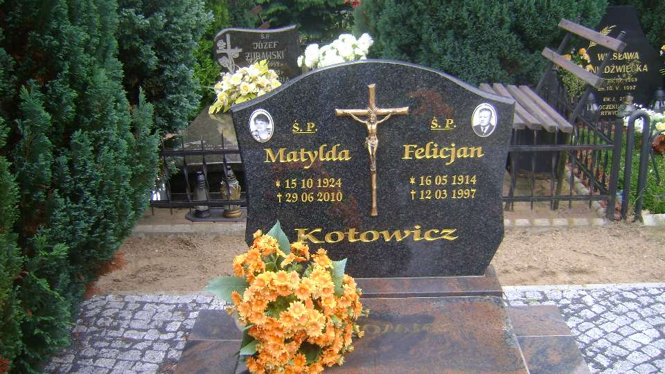 Grób: XII.3.18 Kotowicz Felicjan ur.:16.05.1914 zm.:12.03.1997 Kotowicz Matylda ur.:15.10.1924 zm.:29.06.2010 |