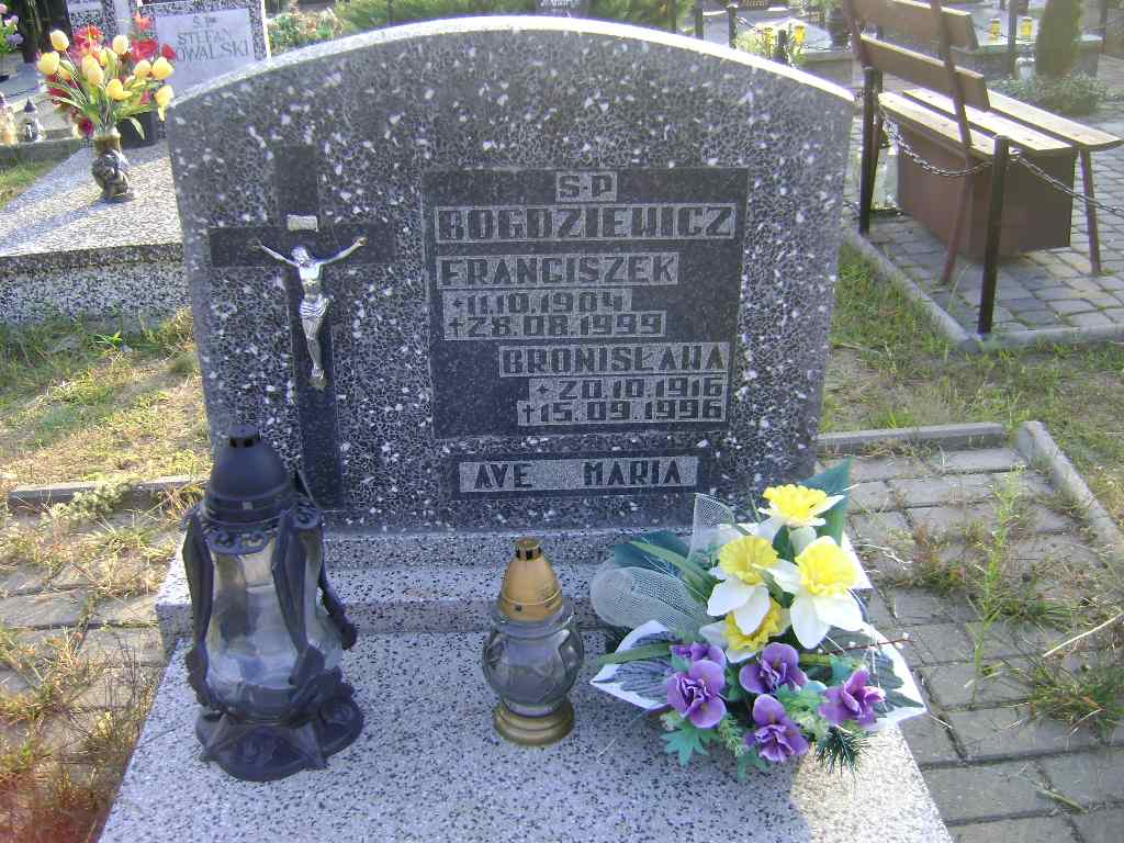 Grób: XII.5.6 Bogdziewicz Bronisława ur.:20.10.1916 zm.:15.09.1996 Bogdziewicz Franciszek ur.:11.10.1904 zm.:29.08.1999 |