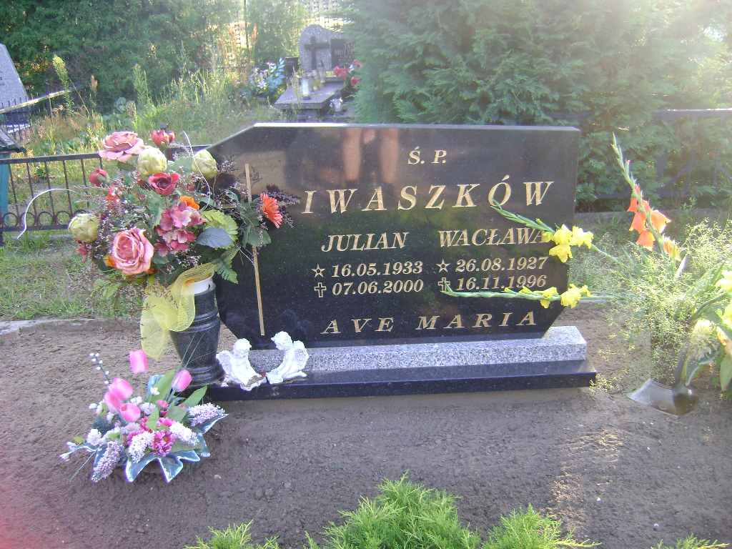 Grób: XII.8.4 Iwaszków Wacława ur.:26.08.1927 zm.:16.11.1996 Iwaszków Julian ur.:16.05.1933 zm.:07.06.2000 |