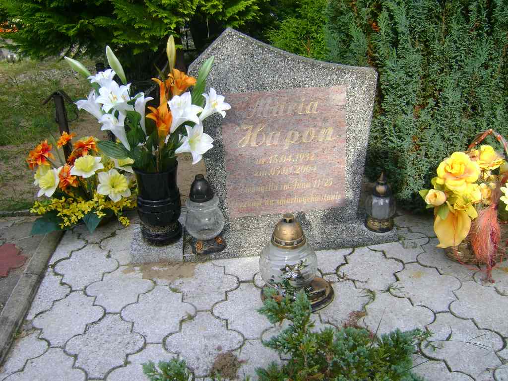 Grób: XIII.4.9 Hapon Maria ur.:18.04.1932 zm.:15.01.2004 Hapon Gerard ur.:24-08-1983 zm.:01-12-2022 |