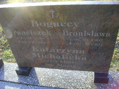 Grób: I.3.10 Bogacka Bronisława ur.:15.03.1907 zm.:13.07.1969 Bogacki Franciszek ur.:11.04.1899 zm.:24.07.1984 Michalicka Katarzyna ur.:1878 zm.:1950 |