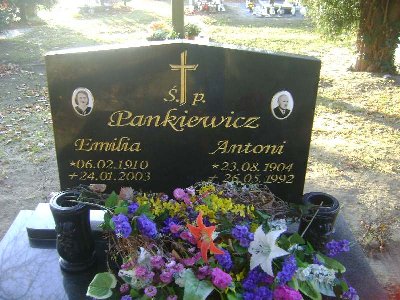 Grób: II.3.16 Pankiewicz Antoni ur.:23.08.1904 zm.:26.05.1992 Pankiewicz Emilia ur.:6.02.1910 zm.:24.01.2003 |