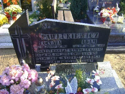 Grób: I.2.12 Pawlukiewicz Eugenia ur.:24.07.1929 zm.:12.12.1969 Pawlukiewicz Adam ur.:15.08.1920 zm.:7.07.1995 Pawlukiewicz Edward ur.:29.01.1951 zm.:19.03.2009 |