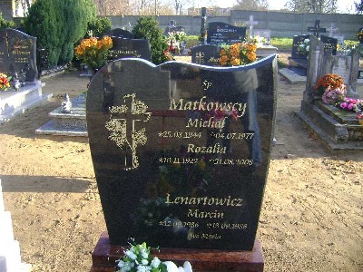 Grób: I.4.7 Lenartowicz Marcin ur.:12.09.1986 zm.:13.09.1986 Matkowska Rozalia ur.:10.11.1922 zm.:31.08.2008 Matkowski Michał ur.:25.03.1944 zm.:4.07.1977 |
