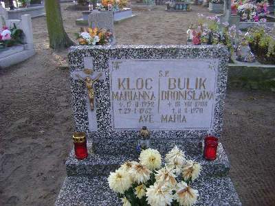 Grób: I.8.9 Bulik Bronisław ur.:18.08.1908 zm.:11.02.1970 Kloc Marianna ur.:15.02.1939 zm.:29.01.1962 |