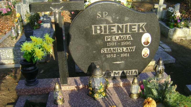 Grób: I.15.2 Bieniek Pelagia ur.:1901 zm.:1996 Bieniek Stanisław ur.:1.5.1892 zm.:23.10.1961 |