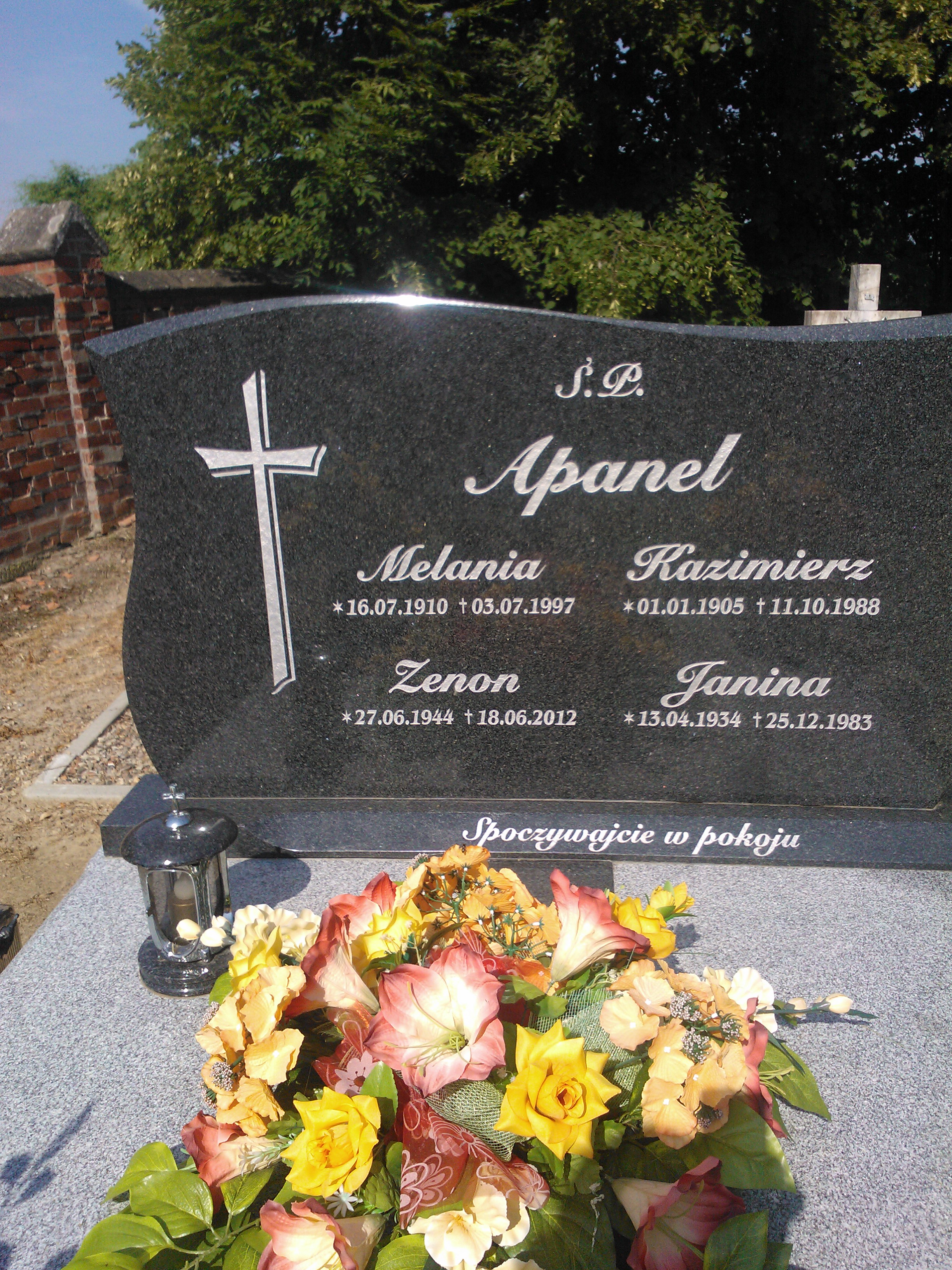 Grób: I.3.1 Apanel Melania ur.:16.07.1910 zm.:03.07.1997 Apanel Kazimierz ur.:01-01-1905 zm.:11-10-1988 Apanel Janina ur.:13-04-1954 zm.:25-11-1974 Apanel Zenon ur.:27-06-1944 zm.:18-06-2012 |