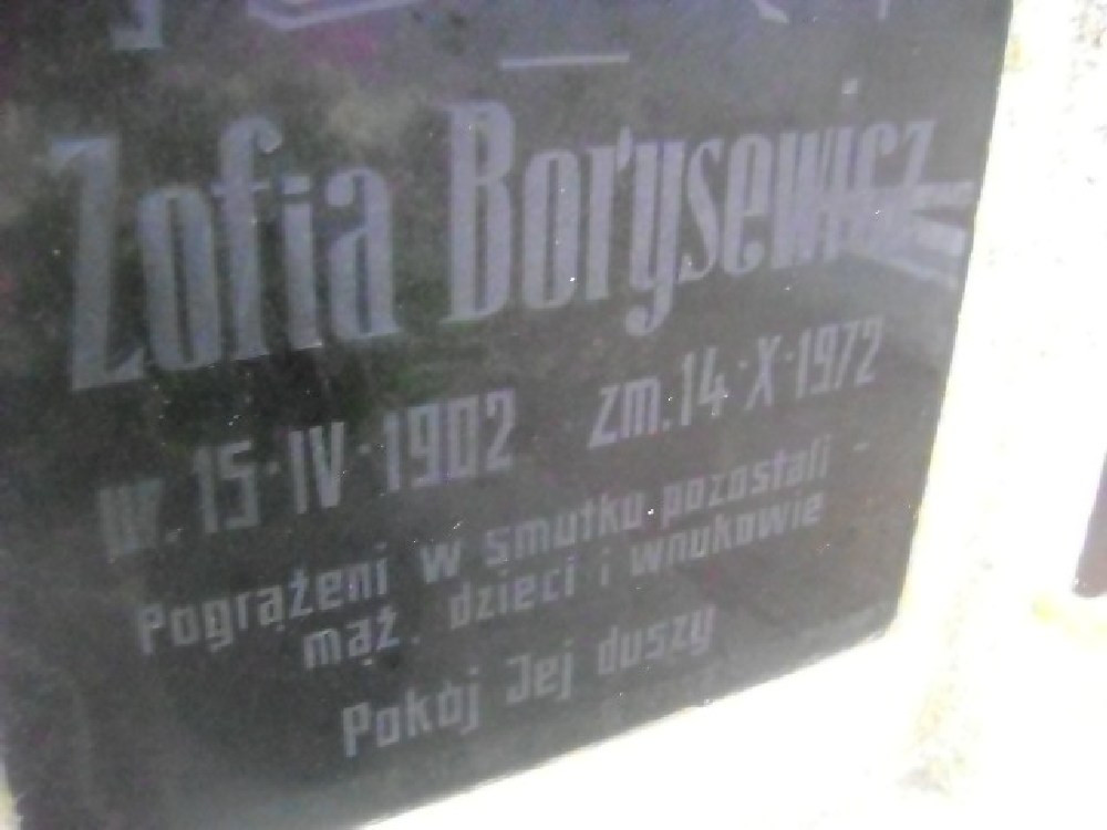 Grób: I.6.27 Borysewicz Zofia ur.:15.04.1902 zm.:14.10.1972 |