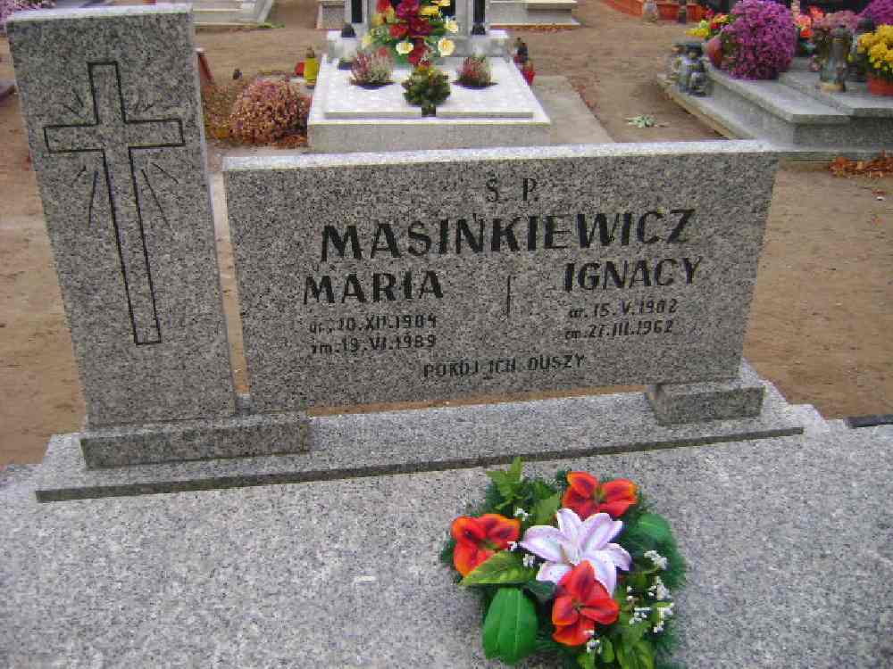 Grób: I.7.12 Masińkiewicz Maria ur.:10.12.1904 zm.:19.07.1989 Masińkiewicz Ignacy ur.:15.05.1902 zm.:27.03.1962 |