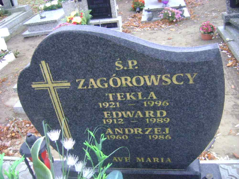 Grób: III.1.16 Zagórowska Tekla ur.:1921 zm.:1996 Zagórowski Edward ur.:1912 zm.:1989 Zagórowski Andrzej ur.:1960 zm.:1986 |