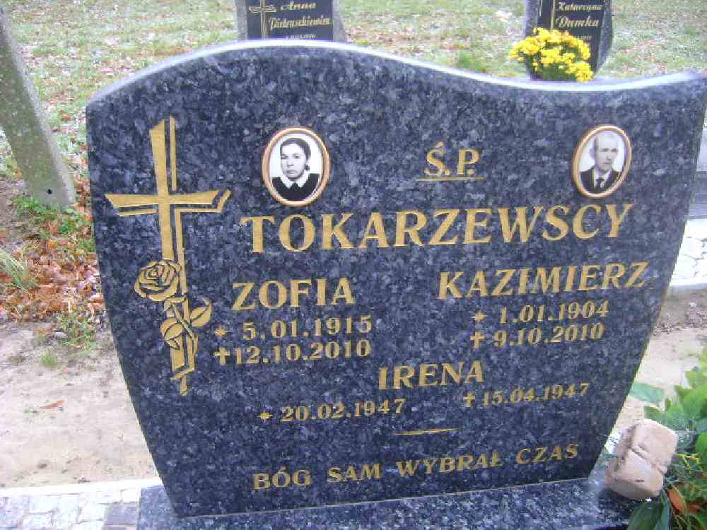 Grób: III.2.12 Tokarzewska Zofia ur.:05.01.1915 zm.:12.10.2010 po prawej Tokarzewska Irena ur.:20.02.1947 zm.:15.04.1947 Tokarzewski Kazimierz ur.:01.01.1904 zm.:09.10.2010 po prawej Tokarzewska Zofia ur.:11-08-2018 zm.:11-08-2018 ur.: zm.: Tokarzewski Kacper ur.:06-01-2020 zm.:06-01-2020 |