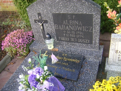 Grób: I.1.18 Baranowicz Albina ur.:16.03.1906 zm.:11.08.1994 Baranowicz Korneliusz ur.:1897 zm.:1945 pochowany w Trabach |